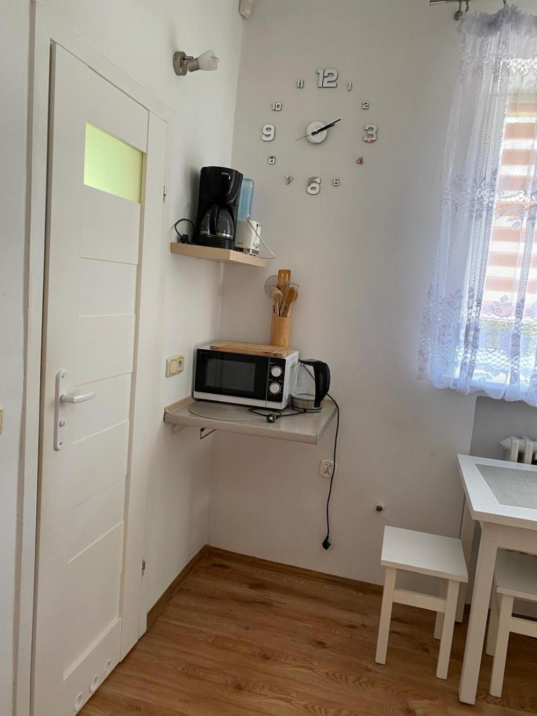 Kuchnia jest w pełni wyposażona w stół, ekspres do kawy ☕, toster, płytę kuchenną, przybory kuchenne, czajnik elektryczny, kuchenkę mikrofalową, lodówkę oraz środki czystości.